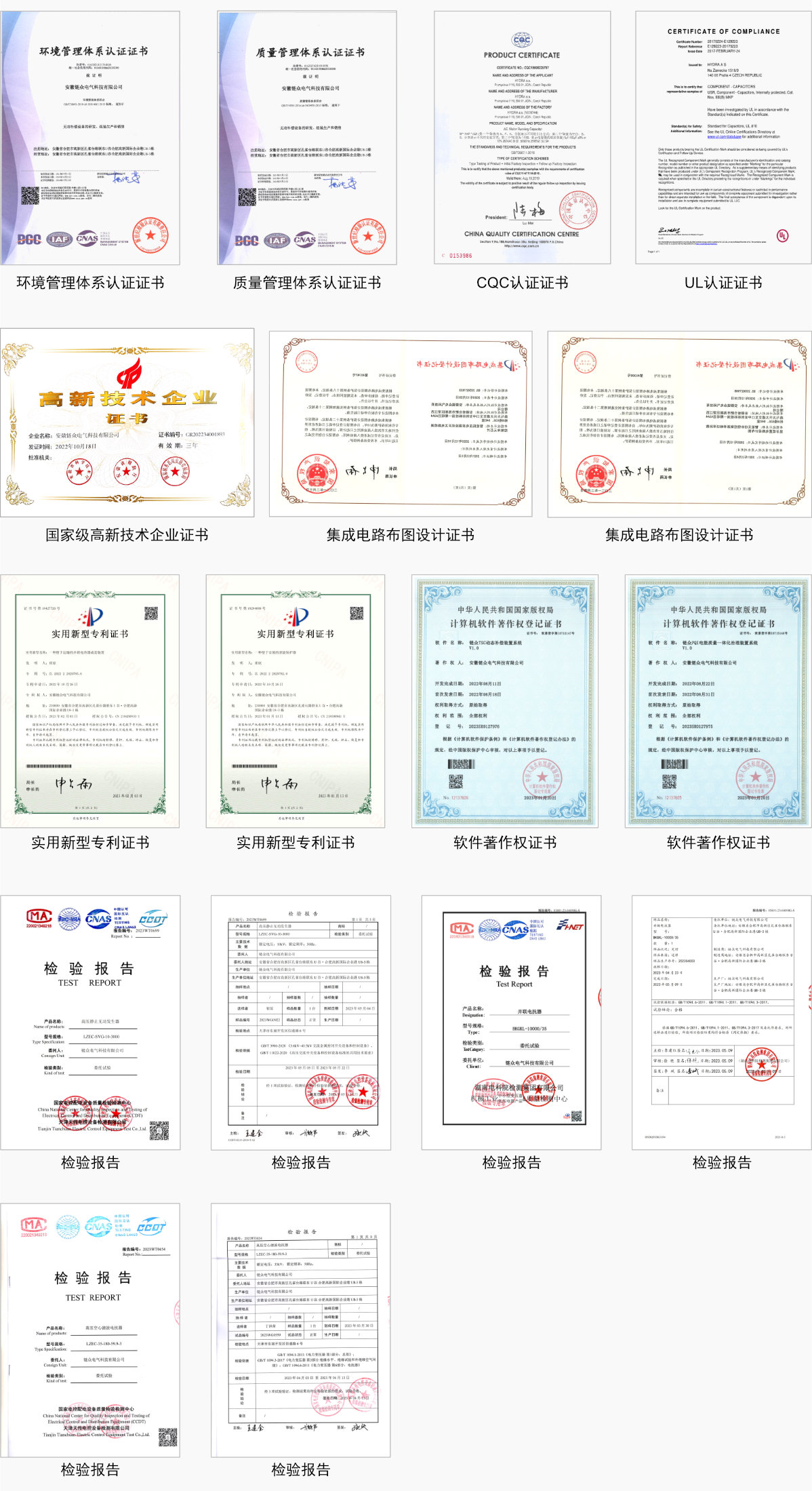 公司所有产品均获得国家级检验报告。 获得注册商标8件、取得实用新型专利12件、软件著作权12件、集成电路布图2件。 获得国家级高新技术企业、科技型中小企业、合肥市大数据企业、ISO14001、9001质量体系认证、AAA级信用单位、诚信经营示范单位、质量服务荣誉信誉等证书。 以下展示部分证书和检验报告